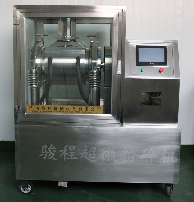 粉碎過程中,填充介質與介質之間,介質與藥物之間,藥物與藥物之間會發生劇烈的摩擦和撞擊,產生大量熱能,溫度急劇上升,導致藥物軟化,增加粉碎難度。一些熱敏性、含糖量高及富含揮發性成分的藥物采用一般粉碎機都很難粉碎。駿程超微粉碎機為粉碎設備配置制冷系統,將粉碎溫度溫度控制在10度以下,藥物的質地相對較脆,能夠較好的控制粉體的粒徑。